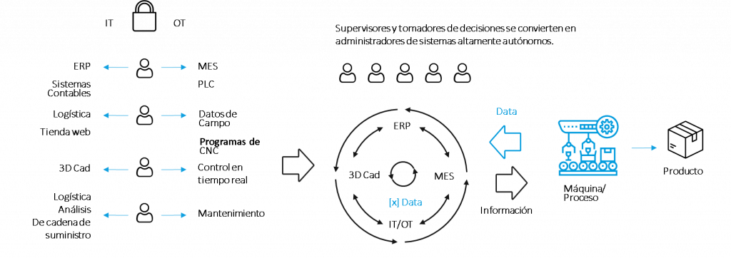 Para hacer que las máquinas y los sistemas sean más flexibles y puedan ser capaces de tomar decisiones inteligentes de forma autónoma, necesitan un flujo continuo de datos e información. Incluso hoy, las empresas ya tienen muchos datos, pero no generan información de él, o lo guardan en sistemas separados “SILOS” y es imposible derivar decisiones para el próximo nivel de gestión.